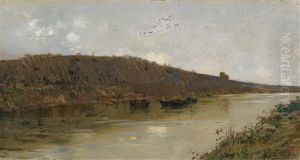 River Scene At Dusk With Boats And Figures