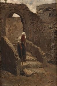 Innenhof Eines Suditalienischen Hauses Mit Gewolbekeller, Vor Dem Zwei Frauen Sitzen