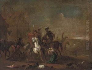 A Cavalry Battle Scene Between Turkish And Christian Troops, With A View Of A Town Beyond