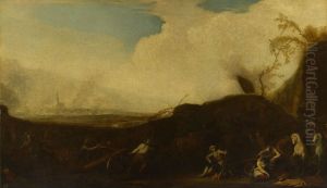 Schildering "Veldslag" olieverf op hout, door Georg Philipp Rugendas, ingelijst