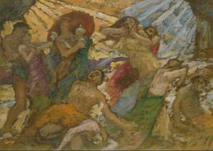 A Naked Woman Bathing With Swans, A Classical Temple Beyond