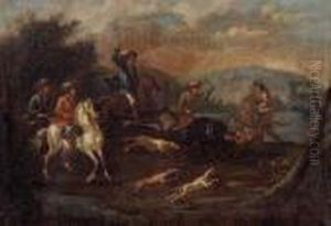Wildschweinjagd Zu Pferde, Im Vordergrund Ein Hundemeute Mit Ihrer Beute