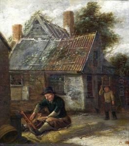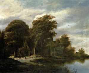 A Wooded Landscape With Peasants In A Courtyard Near A Farm With A Stream In The Foreground