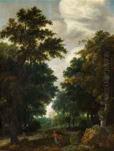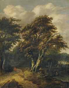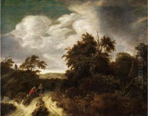 A Wooded Landscape With A Traveller And His Dog On A Track, A Village With Peasants Beyond