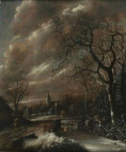 A Winter Landscape With Figures Chopping Wood And Sleighing On Afrozen River Near An Inn