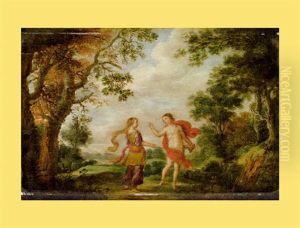 A Wooded River Landscape With A Hunter And His Dogs On A Track