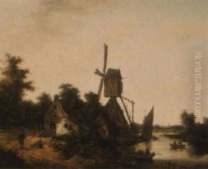 Landscape With A Windmill Beside A River, With Figures Boating, Others Resting On A Path