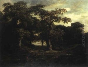 A Mother And Child Walking Along A Woodland Path Beside A Cottage Where Peasants Rest, With A View Of Haarlem And The