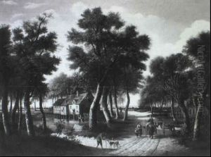 A Wooded Landscape With A Traveller And His Dog On A Track, A Village With Peasants Beyond