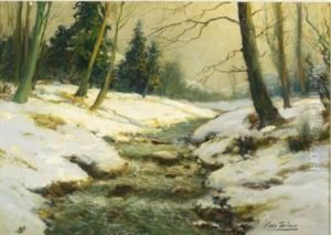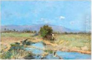 A Wooded Hilly Landscape With Two Figures By A Stream