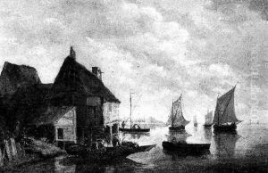 Fishermen Unloading Lobster Pots On A River, With An Angler And Moored Sailing Ships By A Farm Beyond