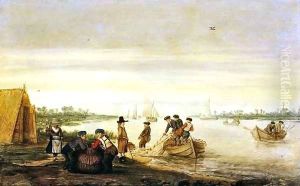 A River Estuary With Figures Pulling In Their Nets By A Fort