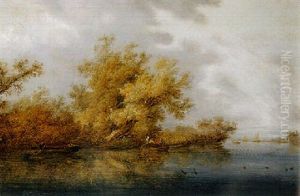 A calm A wooded river landscape with fishermen and sportsmen in rowing boats, sailing ships beyond Oil Painting - Salomon van Ruysdael