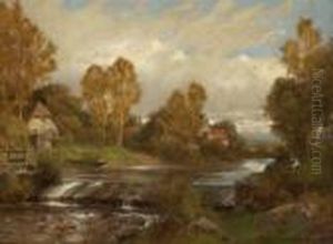 Bewaldete Flusslandschaft Mit Bauernhauser Und Einer Fahre