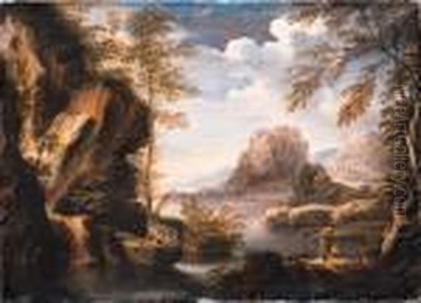 A Mountainous River Landscape With Peasants Conversing On Abank