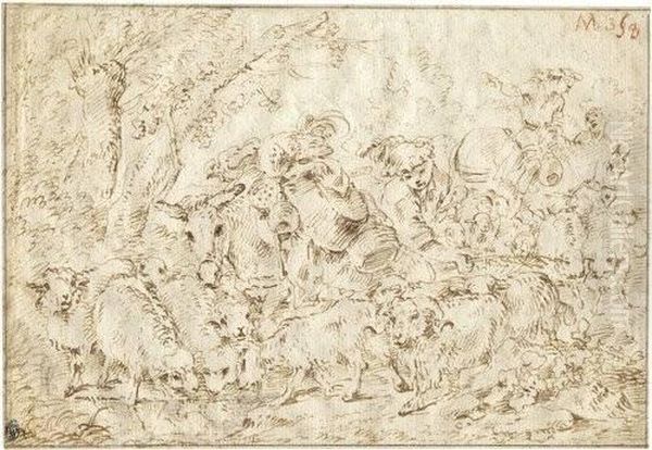 Pastorale Szene Mit Schafhirtem Und Seinem Vieh, Verso: Kuchenszene