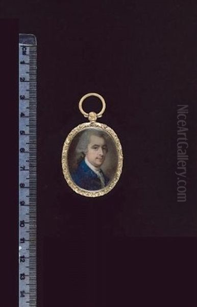 A Gentleman, Wearing Blue Coat With Gold Figured Button Holes, White Lace Cravat And Powdered Wig Worn En Queue With A Black Ribbon Bow