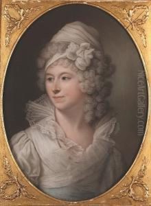 A Lady, Wearing Pink Dress With White Trim And A Green Robe Draped Across Her Left Shoulder, Her Hair Powdered And Adorned With Strands Of Pearls.