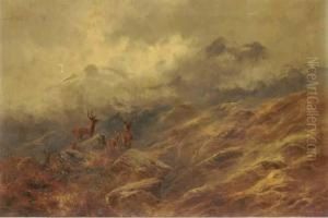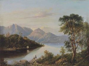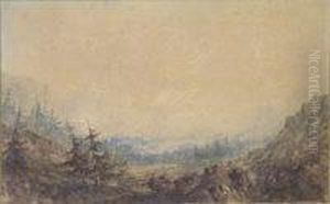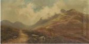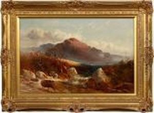 Sheep In A Highland Landscape; A River Landscape With Mountains Beyond