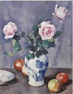 Mixed Roses In A Brown Vase With A Cup, Saucer And Apples