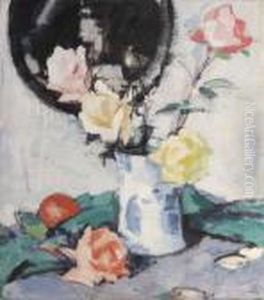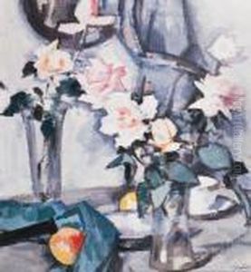 Still Life Of Roses In A Glass Vase With Fruit In A Dish