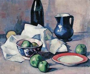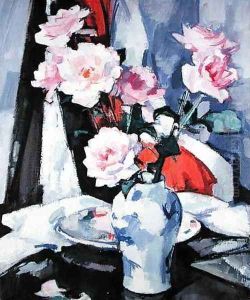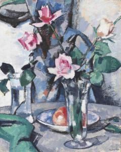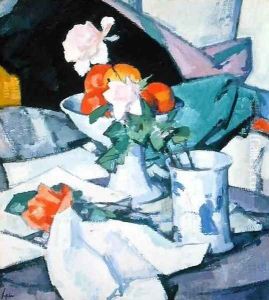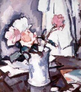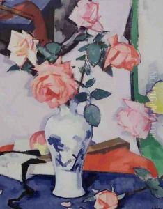 Still Life With Pink Roses And Oranges In A Blue And White Vase