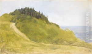 Figures Resting On A Bank Above A River At Sunset