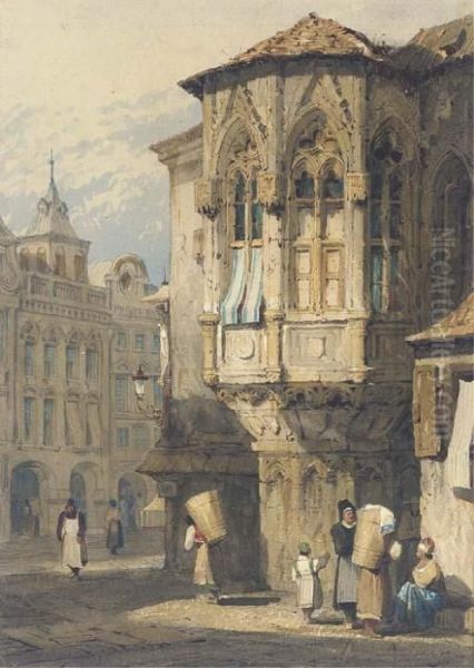 A Continental Street Scene Oil Painting by Samuel Prout