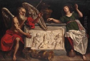 Trompe-l'oeil Mit Einem Dreifigurigen Genrebild Und Einer Aufgehangten Zeichnung
