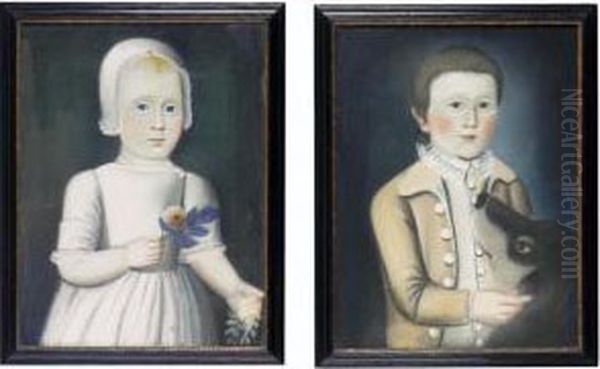 A Pair Of Portraits Of A Sister And Brother: Young Girl In Lace Cap With Rose, And Boy With A Large Brown And Gray Dog