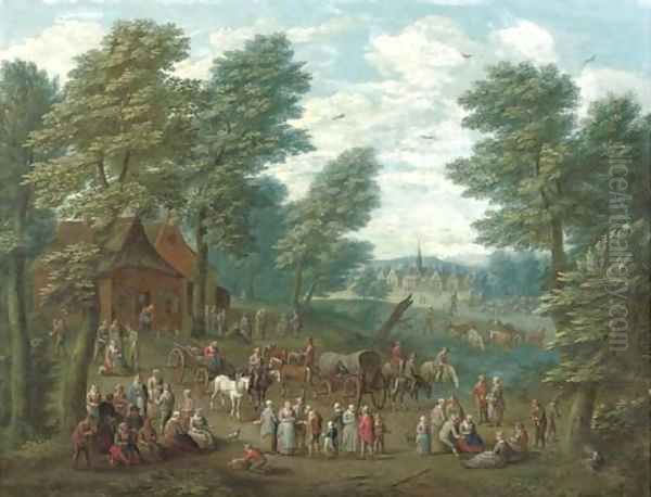 A wooded landscape with numerous peasants and carriages in an open clearing