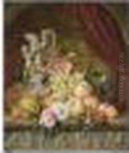 A Flower Still Life And A Butterfly On A Stone Ledge