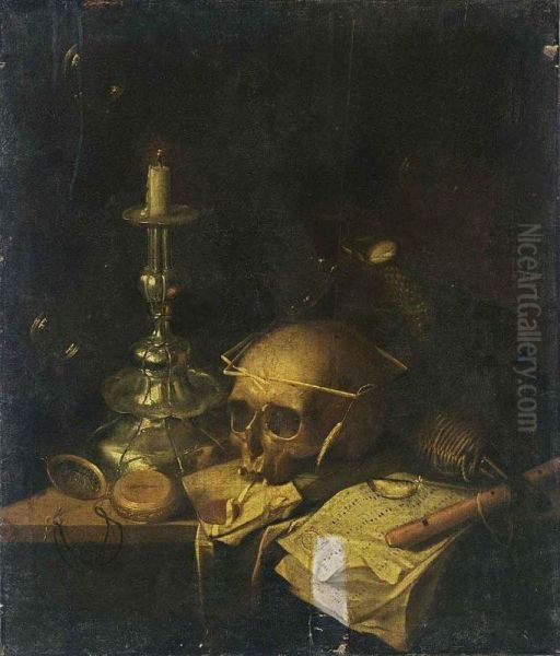 A Vanitas Still Life With A Skull, A Watch, A Candlestick, A Letter, A Music Score, A Flute And A Bottle, Together With Bubbles, All On A Wooden Ledge