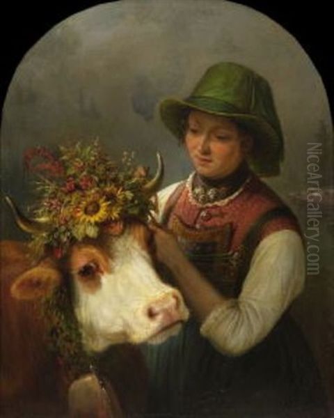 Junge Sennerin Mit Einem Ochsen Oil Painting by Sebastian Habenschaden