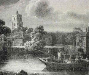 A Moonlit Lake Landscape With A Ruined Church And Boys Fishing From A Boat