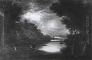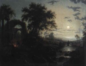 Moonlit River Landscape With Classical Ruins And Figures By A Fire