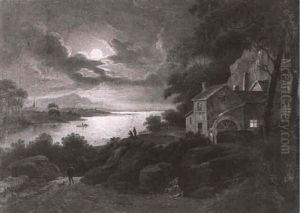 Moonlit River Landscape With A Figure Crossing A Bridge
