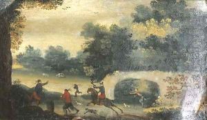 A hawking party in an extensive wooded landscape