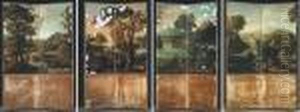 A Mountainous River Landscape With Travellers, A Town Beyond; And Amountainous River Landscape With An Elegant Couple Journeying Withtheir Servants, A Fortress And A Bridge Beyond