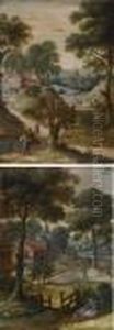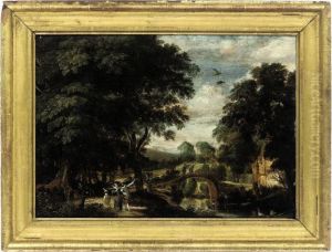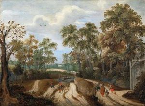 A Wooded Hilly Landscape With Elegant Travellers And A Horse-drawn Wagon On A Path, Near A Village