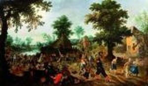 A Wooded Landscape With Elegant Figures Riding, Shooting Andconversing, A Village Beyond