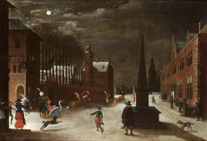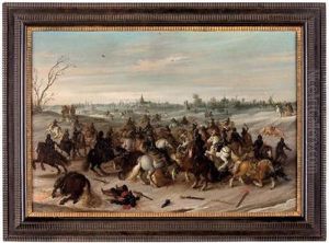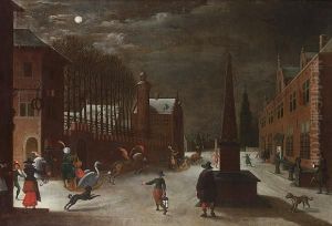 A Moonlit Winter Landscape With Figures In Horse-drawn Sledges And Townsfolk Looking On