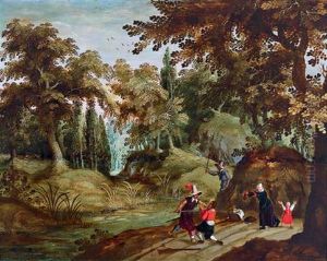 A Wooded River Landscape, With Huntsmen On A Country Path
