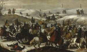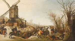 Travellers Ambushed On A Snow-covered Path Before A Windmill
