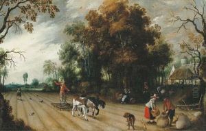 A Wooded Landscape With Travellers In A Horse-drawn Cart, Peasants And Cattle On A Country Road