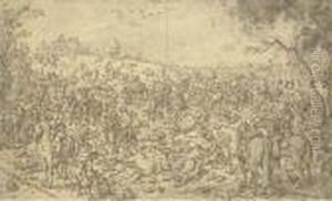A Crowd Watching An Entertaining Monkey; A Salesman Addressing A Crowd; A Woman Escaping The Clutch Of Three Men As A Seated Gentleman Looks On