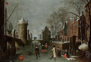 A Winter Townscape With Figures Skating On A Frozen Canal And Townsfolk Looking On