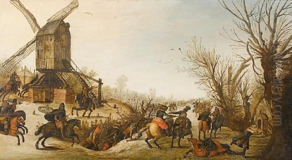 Travellers Ambushed On A Snow-covered Pathbefore A Windmill