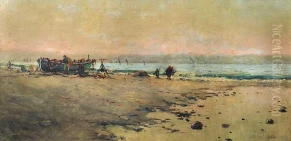 Costa Con Pescadores Oleo Sobre Tela Reentelado