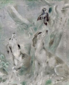 Dogs And Bird Oil Painting by Sei Koyanagui